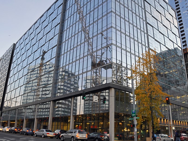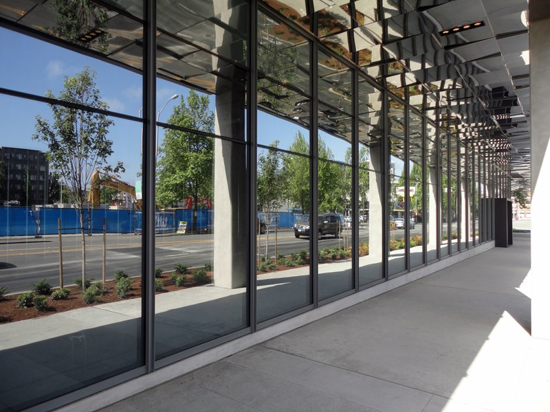 A unique feature installed on this project was the structural point-supported glass wall system designed and engineered by Nupress Facades, with glass supplied out of Canada by Garibaldi Glass. This system highlights the main entry of the Office building and creates a seamless glass wall supported entirely by spider fittings at each corner, completely eliminating the sight lines created by typical curtain wall mullions. Inset within this system was also a revolving glass door provided by Boon Edam and installed by Mission Glass. Other notable features installed by Mission Glass were the point-supported glass canopies, porte cochere glass ceiling, and glass guardrails at the level 2 exterior terrace space.