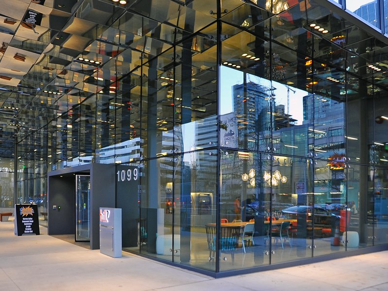 A unique feature installed on this project was the structural point-supported glass wall system designed and engineered by Nupress Facades, with glass supplied out of Canada by Garibaldi Glass. This system highlights the main entry of the Office building and creates a seamless glass wall supported entirely by spider fittings at each corner, completely eliminating the sight lines created by typical curtain wall mullions. Inset within this system was also a revolving glass door provided by Boon Edam and installed by Mission Glass. Other notable features installed by Mission Glass were the point-supported glass canopies, porte cochere glass ceiling, and glass guardrails at the level 2 exterior terrace space.